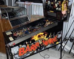Despite the polarizing thematic elements, the gameplay of "Barb Wire" frequently earns positive remarks. Many players find the game surprisingly engaging, citing its fast-paced action and the inherent challenge. The playfield layout is generally well-regarded for its design and flow, offering a good variety of shots and ramps that contribute to enjoyable combos. The "Big Fatso" mechanism is a standout, praised for its unique interaction and impact on shot strategy, as is the skill shot. The "Haywire" mode is consistently highlighted as a particularly satisfying wizard mode. Reviewers often note that the rules, while not overly complex, possess enough depth to keep players interested beyond initial plays, and the game’s various multiball modes, including the timed ball save, are appreciated. For some, the game's relatively forgiving nature to newer players makes it an accessible title.